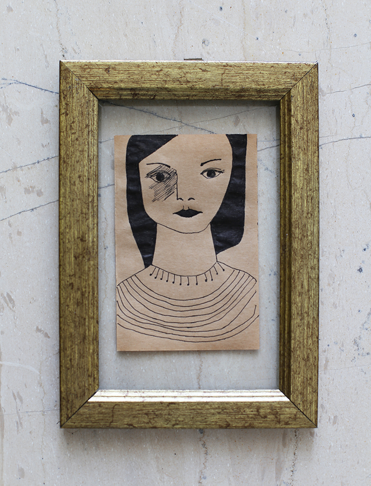 This small drawing is part of a series of quick abstracted portraits on cheap paper. Occasionally I use ink, liquid ink, markers, or water-colour. They express a moment, a certain feeling, a certain look. These drawings are an exploration of the female persona, underlying the majority of my work.