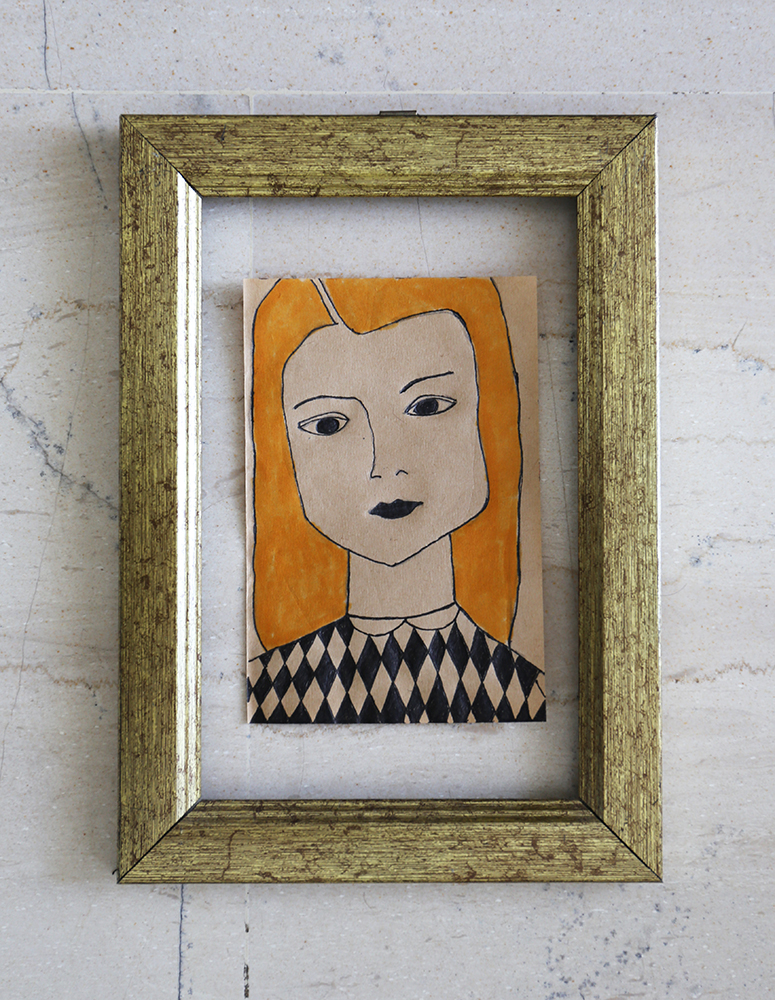 Retro Girl ink and marker drawing on brown kraft eco-friendly recycled paper.