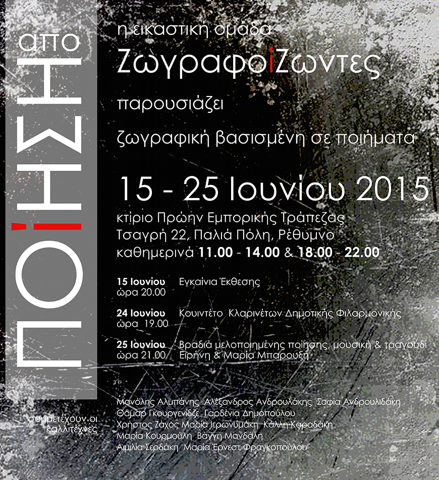 Our art group exhibition took place in The Former Commercial Bank of Greece in Rethymno from 15 until 25 of June 2015. Our art group is called “ΖωγραφοίΖωντες” (it’s a pun on the name “painters” and “those who are alive”) and currently has twelve members.